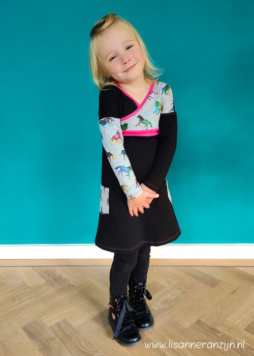 Tijdens de pretest mocht ik voor Mila een overslagjurk maken met lange mouwen. De daadwerkelijke overslag dus, niet de ‘faux’ overslag. Deze versie heeft sowieso een tailleboord vanwege het vastzetten van de overslag. Ik nam verschillende stoffen voor de voorpanden en wisselde de mouwen om voor een funky effect. Weer eens wat anders haha. Deze jurk deed ik met zakken, maar daar kun je heel eenvoudig op het laatst over beslissen. De overslag gaat super over het hoofd. Dat vindt Mila altijd wel prettig. De jurk hoort op de knie te vallen, maar de lengte is natuurlijk naar wens langer of korter te maken. Mila vindt het een heerlijk jurkje en ze kan er fijn in spelen. De tailleboord zit iets onder de borstlijn en dus niet echt in de taille.